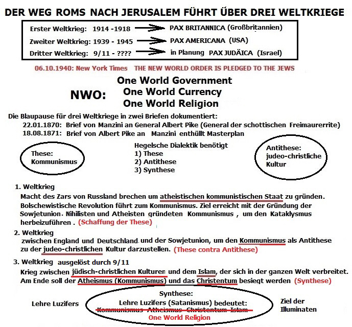 Und warum wird nun so intensiv von irgendwelchen Typen an einem Dritten Weltkrieg gearbeitet? Man könnte fast einen Verdacht bekommen, dass auch dahinter ein Plan steckt. Es ist ein Verdacht, der vom Hochgradfreimaurer Albert Pike niedergeschrieben wurde, dass nämlich sogar ein Dritter Weltkrieg geplant ist. Seit dem 11. September 2001 wissen wir, dass dies ein Auslöser sein sollte. Gründe für 9/11 . Wenn Sie sich für die Aussagen von Freimaurern interessieren, dann wechseln Sie zunächst auf die Seite Albert Pike auf meiner Homepage. Die Aussagen von Freimaurern sind immer sehr interessant!! Pearl Harbor war der Grund, weshalb die USA in den Zweiten Weltkrieg eintraten. Mit Pearl Harbor konnte man der Öffentlichkeit den Eintritt in den Zweiten Weltkrieg gut rechtfertigen. 9/11 war der Beginn des Dritten Weltkrieges und man muß verstehen, dass die Kriege nach 9/11 vor allem den Zionisten nutzen, weil ihr Plan eines Greater Israel schon längst (also vor 9/11) niedergeschrieben worden war. Beachten Sie nur die PNAC-Studie und der Hinweis auf ein noch nicht definiertes katalysierendes Ereignis, "ähnlich einem Pearl Harbor". Diese Faschisten verraten sich immer selbst! 9/11 war dann dieses Ereignis. Weiterfolgende Links sind These Antithese . Denn These und Antithese führen gemäß der Hegelschen Dialektik zur Synthese in Form einer ausgearbeiteten Lösung aus den Dritten Weltkrieg. Die Lösung hieße dann NWO.