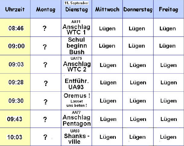 Conclusio: Es ist aus meiner Sicht kein Zufall, dass es zum eigentlichen Ablauf so viele Unstimmigkeiten gibt. Politiker haben kein so schlechtes Gedächtnis, dass sie sich nicht an alle Einzelheiten ihres Handelns und ihrer Wahrnehmung an einem so denkwürdigen Tag wie dem 11. September erinnern können. Im Fall von Bush muß es einen speziellen Grund für diesen Gedächtnisverlust gegeben haben. Er vermischte das, was er möglicherweise als Insider bereits vorher wußte mit dem, was ihm von denjenigen empfohlen wurde zu sagen, die das Drehbuch für 9/11 geschrieben hatten. Das zu unterscheiden ist in der Tat schwierig für einen mittelmäßigen Politker wie Bush. Aber vielleicht steckte auch darin eine Strategie. Auf jeden Fall ist es eine Strategie der totalen Verwirrung der Öffentlichkeit.