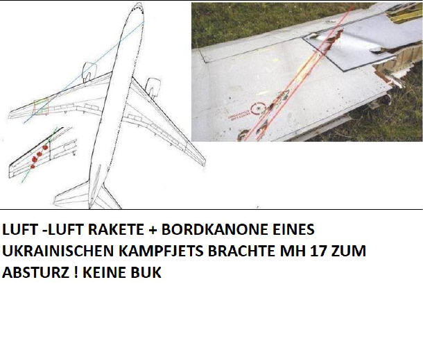Im folgenden Video wurde recherchiert, dass die MH17 NICHT durch eine BUK Rakete abgeschossen wurde, sondern von einem Kampfjet der Ukraine. Billy Six unterstellt allerdings auch der russischen Regierung bei der Präsentation, keine Rohdaten der Radardaten zu liefern, was der Manipulation Tür und Tor öffnet. Eine sehr gute Recherchearbeit. Es wurden 100 Zeugen befragt, aber niemand konnte bezeugen, dass eine BUK Rakete abgeschossen wurde. Eine BUK Rakete hätte in wenigen Sekunden nach dem Start einen Überschallknall erzeugt, was aber niemand vor Ort bezeugen kann. Außerdem hätte der Chemtrail der BUK für mindestens 10 Minuten in der Luft stehen bleiben müssen, was auch nicht bildlich dokumentiert ist. Der Zeuge, der von der Ukraine präsentiert wurde und den angeblichen Abschuss der BUK Rakete bezeugt, war in der Öffentlchkeit anonymisiert worden. Warum wohl? Die Sache stinkt zum Himmel. KEINE WEITRÄUMIGE VERTEILUNG EINES SPLITTERGÜRTELS. NUR IM COCKPITBEREICH IM COCKPIT SPEZIELLE LÖCHER >>BORDKANONE + LUFT-LUFT RAKETE