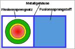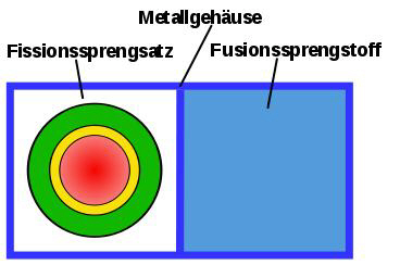 Da zur Kernfusion (b) enorme Energiemengen benötigt werden, werden alle Wasserstoffbomben mit Hilfe einer Kernspaltung (a) gezündet, welche die benötigte Energie sehr schnell bereitstellt und den Fusionsprozess (b) in Gang setzt (Fission-Fusion-Prinzip). Bei Kernfusionswaffen (Wasserstoffbomben) dient also ein herkömmlicher Atomsprengsatz (Fissionssprengsatz) dazu, die Wasserstoffisotope Deuterium und Tritium zu verschmelzen (fusionieren).