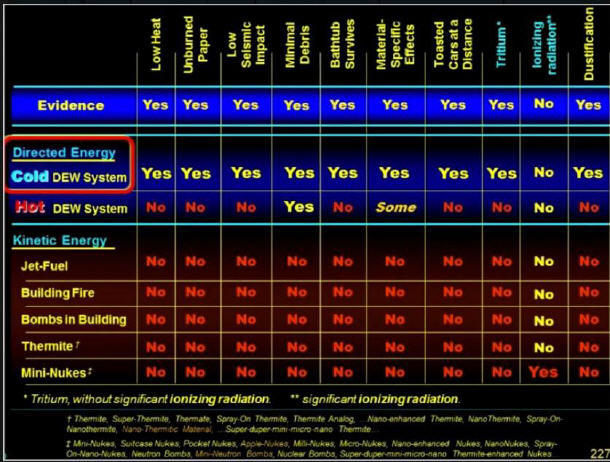 Übersetzung: "Die empirisch nachweisbare Beweise vom 11. September sind überwältigend, weil es nur eine Möglichkeit gibt, all dies zu erklären. Nichts anderes kommt dem näher. Nur die allgemeine Kategorie einer Waffentechnologie, die auch als "Direkte Energie Waffe" bekannt ist (DEW) , kann all diese empirisch nachweisbaren Belege von 9/11 erklären, und sie tut es vollständig und unwiderlegbar. Mit anderen Worten: Es wurde eine allgemeine Art von Waffe, die als "direkte Energiewaffe" bekannt ist angewendet, um die WTC-Gebäude am 11. September 2001 beim Fall zumeist auf halben Weg zum Boden in Staub zu verwandeln. Und diese Schlußfolgerung ist unwiderlegbar, weil die große Anzahl an verfügbaren, leicht verifzierbaren und empirisch nachweisbaren Beweisen vom 11. September 2001 uns dies ohne irgendeinen Zweifel zeigt. Flugzeugtreibstoff, Flugzeuge, Sprengsätze irgendwelcher Art und all die anderen Arten von zerstörerischen Kräfte sind nicht im entferntesten vereinbar mit der großen Anzahl von empirisch nachweisbaren Beweisen vom 11. September 2001. Nur direkte Energiewaffen sind auf überwältigende Art und Weise vereinbar mit dieser Beweislage."
