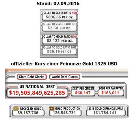 http://www.usdebtclock.org/ Stand 01.09.2016 = 8121 USD pro Feinunze (Dollar-to-Gold Ratio) Stand 11.01.2017 = 9117 USD pro Feinunze (Dollar-to-Gold Ratio)