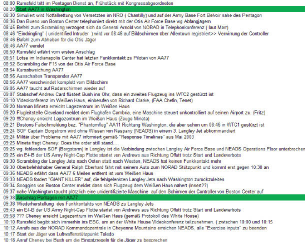 "Während der Zeit, als das Flugzeug auf das Pentagon zuflog, war da ein junger Mann der kam und zu dem Vize-Präsidenten sagte: "Das Flugzeug ist 50 Meilen außerhalb, das Flugzeug ist 30 Meilen außerhalb" und als er dann sagte, dass das Flugzeug noch 10 Meilen außerhalb war, sagte der junge Mann zum Vizepräsidenten "Steht die Order noch?" Und der Vizepräsident drehte sich um, drehte seinen Nacken und sagte: "Natürlich steht die Order noch! Haben Sie irgendetwas gegensätzliches gehört. Aber zu dieser Zeit wußte ich nicht was das bedeutete".