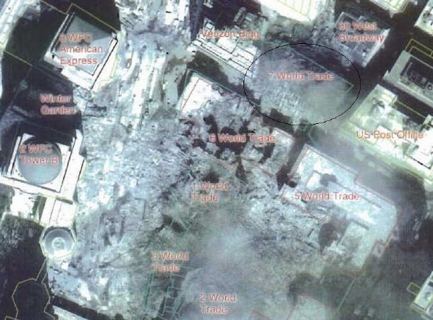 Erstaunlich ist die Zerstörung des WTC7, nicht nur weil es in 7 Sekunden am späten Nachmittag in sich zusammensackte. Dimitri Khalezov ist der Meinung, dass unter dem WTC1, WTC2 und WTC7 jeweils eine thermonukleare Bombe gezündet worden sein muß. Die dunklen Flecken auf den Bildern sind jedenfalls sehr verdächtig. Beim WTC7 liefert Khalezov sogar eine sehr plausible Erklärung für die Teilzerstörung des angrenzenden nördlichen Gebäudes außerhalb des WTC-Komplexes. Das WTC7 selbst war trapezförmig. Die Position der Bombe müßte unterhalb der längsten nördlichen Kante des Gebäudes gewesen sein. Vor allem auch deshalb, weil sogar das an das WTC7 angrenzende Gebäude an dieser Stelle ein Loch zu zeigen scheint. Denn bei der Explosion um die Zero-Box entsteht ein kugelförmiger Hohlraum. Wenn man sich nun einen Radius von 50 Metern um die Mitte der längsten Kante denkt, dann wäre die Zerstörung des angrenzenden Gebäudes tatsächlich erklärbar und nur ein Kollateralschaden im Zusammenhang mit der Controlled Demolition des WTC7. Der Einsturz des WTC1 kann jedenfalls nicht für die Komplettzerstörung des Gebäudes WTC7 und für die Teilzerstörung des angrenzenden Gebäudes verantwortlich sein.