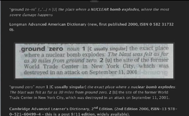 Der Begriff GROUND ZERO kommt aus dem militärischen Bereich, genau genommen aus dem nukleartechnischen Bereich. In unzähligen Lexikas vor dem 11.September 2001 wird der Begriff GROUND ZERO so oder ähnlich definiert.