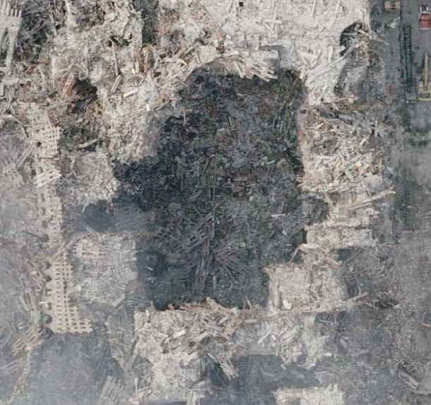 Satellitenaufnahme des WTC - Komplexes. Eingekreist erkennen Sie das WTC7. Deutlich zu erkennen ist, dass WTC5 und WTC6 nicht vollständig zerstört wurden. WTC6 beherbergte übrigens die amerikanische Zollverwaltung sowie die staatliche EXPORT-IMPORT-BANK. Über diese Bank, so schreibt Andreas von Bülow, dürften äußerst zweifelhafte Waffengeschäfte der Administration des früheren Präsidenten Georg Bush ( Senior ) abgewickelt worden sein. WTC6 explodierte um 9:04. Sie haben richtig gelesen: Um 09:04, und damit höchstens 60 Sekunden nach dem Aufprall der Maschine in den Südturm. Ich frage mich auch, wie dieses schwarze Loch in der Mitte des WTC6 entstanden sein könnte. Der Schutt eines Gebäudes jedenfalls würde das Licht in einer anderen Farbe reflektieren. Möglicherweise ein eingestürztes Kellergeschoss? Auch beim WTC7 kann selbst ein Blinder erkennen, dass hier etwas nicht mit rechten Dingen zugegangen ist. Es ist das einzige Gebäude außerhalb des Planquadrats des WTC-Komplexes, welches komplett zerstört wurde, 7 Stunden nach dem Einsturz des Nordturmes. Aber keine Sorge, es war gut versichert.