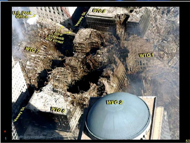Explodierte das Gebäude WTC6 um 09:04 und rieß dort (wie unten auf dem Photo sichtbar) einen riesigen Krater in den Boden, weil dort Akten der Zollverwaltung und der Ex-Im Bank lagerten, die für die Regierung seines Vaters höchst kompromitierend gewesen wären?