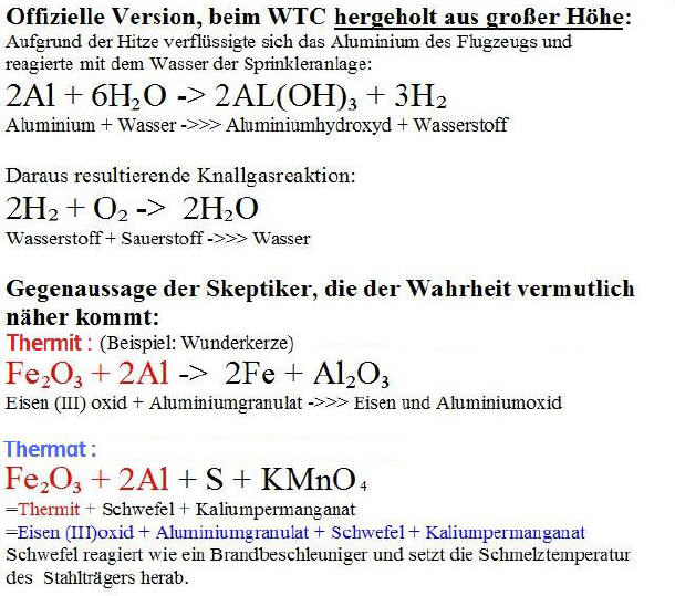 Mit Superthermit wird Stahl zu Butter !............. "Durch das Hinzufügen von Schwefel und Kaliumpermanganat zu Thermit ist es so, als würden Sie ihr Buttermesser stark erhitzen, damit es durch die Butter hindurchsausen kann...."Aber woher kam die Aktivierungsenergie ? Die Lösung: Im WTC7 befand sich ein Umspannwerk und eine Kommandozentrale der CIA...Und was geschah mit WTC7 ? Es fiel etwa 7 Stunden nach dem Einsturz des Nordturmes in sich zusammen. Einsturzgeschwindigkeit: 7 Sekunden