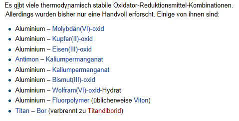 1)Thermit ist ein Gemisch aus Eisen (III) -oxid und Aluminiumpulver, welches nach Zuführung der entsprechenden Aktivierungsenergie stark exotherm zu Aluminiumoxid und Eisen reagiert.