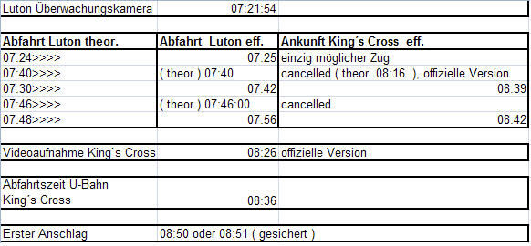 Quelle A: Customer Relations Thameslink: ( Siehe Seite 82 Gerhard Wisnewski, Verschlußsache Terror ) Luton-King´s Cross Thameslink: 07:40 cancelled 07:46 cancelled 07:48 - 08:20 ( ran but with delay due to problemes with the overheadlines in the Mill Hill Area. App. 25 min. delay )