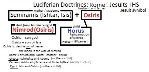 Nimrod entwickelte die Astrologie und legte den Grundstein für die schwarze und weiße Magie. Die satanischen Wurzeln der römisch-katholischen Kirche und ihrer Mysterien-Religion liegen in Babylon. Nimrod wurde von seinem Onkel Shem getötet, der von den üblen Taten seines Neffen Nimrod entsetzt war. Vor seinem gewaltsamen Tod schwängerte Nimrod seine Mutter Semiramis. Nachdem Nimrod getötet war, überzeugte Semiramis die Leute von Babylon, dass Nimrod ein Gott sei (Sonnengott Baal) und dass sie selbst eine Göttin sei (Queen of Heaven). Semiramis entwickelte die satanische Baals Verehrung, verborgene Geheimgesellschaften und dass sie als religiöser Führer das einzige Medium zu Gott wäre. Aus der Figur Semiramis entwickelte sich der Glaube an der Jungfrau Maria, (unbefleckte Empfängnis) und ihrem Sohn Jesus (Baby Nimrod). Das Symbol von Semiramis war der Mond (Isis, Diana) und das Symbol von Nimrod war die Sonne (Horus, Baal, Sol) Semiramis förderte Kinderopfer und das Zölibat für Priester. (Sacrificing babies to Moloch, Satan oder den falschen heidnischen Sonnengott. Semiramis erfand den Tod durch Kreuzigung. Kreuze waren ein okkultes Symbol in Babylon und Ägypten. Semiramis gebar ein weiteres Kind durch ihren Sohn Nimrod während sie behauptete Jundfrau zu sein. Dieses Kind nannte sie Tammuz. Semiramis behauptete, Tammuz wäre die Reinkarnation von Nimrod (Baal) Die Idee von einer jungfräulichen Mutter und ihrem Kind hatte also ihren Ursprung in Babylon. (eine satanische Idee)
