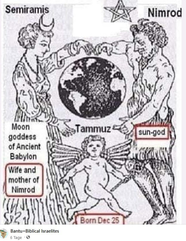 Vater = Nimrod (Sonnengott) = König von Babylon =Sonnengott Baal Mutter = Semiramis (Mond, Queen of Heaven) Kind = Tammuz