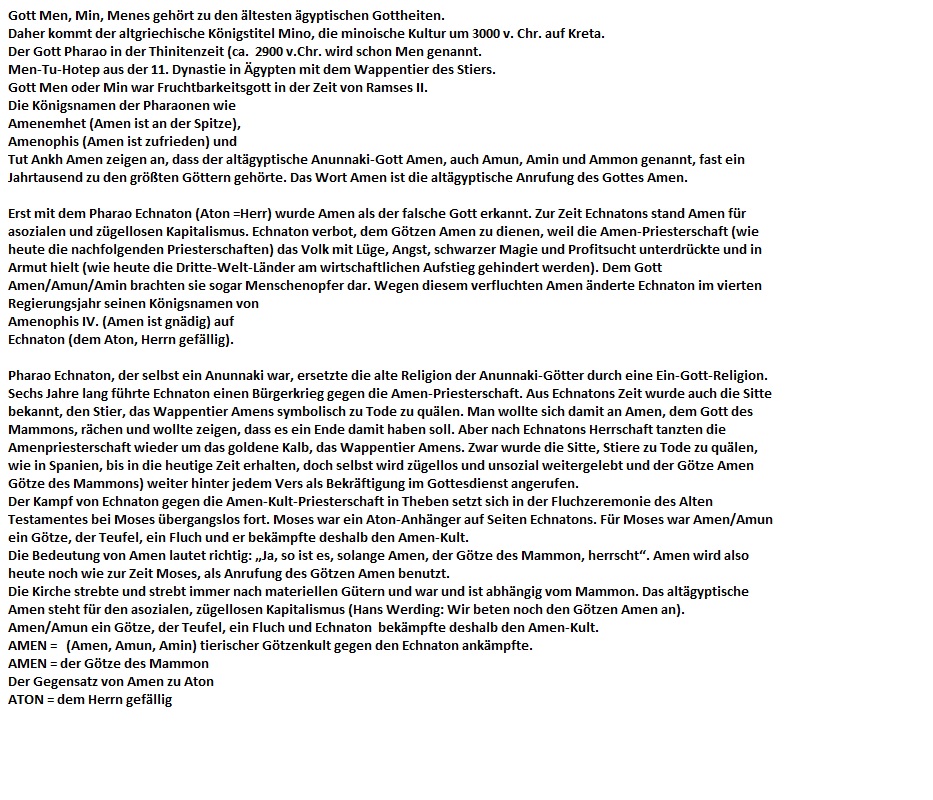 "Amun-Ra" bedeutet "the creator the sun" (Schöpfer der Sonne) Was murmeln die Katholiken am Ende eines Gebetes? Sie murmeln "Amen". Wieder so ein verräterischer Hinweis, dass sich das "Amen"-Gemurmel am Ende eines Gebets von Amun-Ra, dem Sonnengott, ableitet.