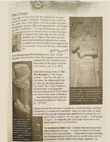 "The Cross was used as a symbol of the Babylonian/Chaldean Sun-god, the mystical “Tau.” The original form of the “T” became the emblem of the Greek/Roman Sun-god “Tammuz”.