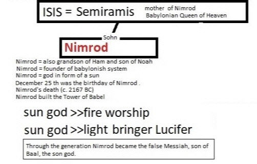 ISIS hatte einen Sohn namens Nimrod . NIMROD wurde später der Ehemann von ISIS. (Inzest) NIMROD (Sohn) = OSIRIS (Ehemann) ISIS (Ehefrau) und OSIRIS (Ehemann = ehemals NIMROD) hatten zusammen einen Sohn namens HORUS. HORUS war die Reinkarnation von NIMROD.