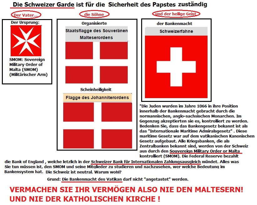 wie der SOVEREIGN MILITARY ORDER OF MALTA trugen dazu bei, den Reichturm der Kirche ständig zu vermehren. Die Entstehung der Zentralbanken ist untrennbar mit den Militärorden der katholischen Kirche verbunden. Ein Menschenleben reicht nicht aus, um das Ausmaß der Verbrechen der katholischen Kirche zu erfassen. Es ist eine Geschichte der Unterwanderung. Es ist eine Geschichte, die bei den Tempelrittern und ihren vatikanischen Gegenspielern, den Hospitalitern in Jerusalem ihren Anfang und dann ihren Weg über Rom, über London und über Washington D.C. nahm. Warum London? Die City of London ist das Zentrum der vatikanischen Finanzmacht. Und auch die SCHWEIZ ist durch die BANK FOR INTERNATIONAL SETTLEMENTS (BIS) ein Teil der Weltdiktatur. Die BIS ist die Zentralbank über den Zentralbanken. Glauben Sie, dass es Zufall ist, dass der Papst von der Schweizer Garde beschützt wird. Es hat Symbolcharakter. Ein Staat mit Bankenmacht muß neutral bleiben, um nicht in Gefahr zu kommen, zerstört zu werden. Da die Gründung der Federal Reserve in den USA auf Rothschilds Bankenmacht zurückgeht, ist die FEDERAL RESERVE im Grunde ein Ableger der BANK OF ENGLAND. Und das Wichtigste: Der Zionist ROTHSCHILD ist "The Guardian of the Vatican Treasury". Follow the money and you will find the perpetrators.....