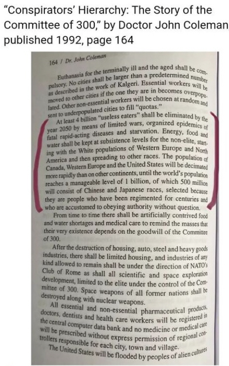 "In Zukunft wird es darum gehen die Bevölkerung zu reduzieren. Wir werden mit den Alten beginnen, denn wenn der Mensch über 60 oder 65 Jahre alt ist lebt er länger als er produziert und das kommt der Gesellschaft teuer zu stehen. Dann die Schwachen und dann die Nutzlosen, weil es immer mehr werden und vor Allem schließlich die Dummen. Die Dummen werden es glauben und darum bitten, behandelt zu werden. Euthanasie (Die Vernichtung lebensunwerten Lebens) richtet sich an diese Gruppen. Wir werden sie los werden, indem wir sie in dem Glauben lassen das es zu Ihrem Besten ist. Die Selektion der Idioten wird sich von selbst erledigen. Sie werden allein zur Schlachtbank gehen." Geschieht nicht soeben exakt DAS!?