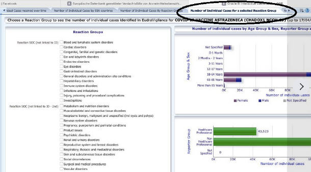 Gehen Sie so vor..... 1) Suchen Sie in der Liste nach COVID-19 2) Klicken Sie in der Auswahl auf einen der vier COVID-19 Impfstoffe 3) Klicken Sie oben in der Menuleiste auf "Number of Individual Cases". 4) Wählen Sie zum Beispiel "Blood and Lamphatic Disorders" 5) Auf der rechten Seite geht dann eine Graphik auf, auf der Sie die Zahl der Problemfälle einsehen können.