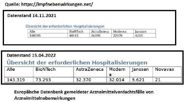 Bei so einer hohen Hospitalisierungsrate wundert es mich nicht, dass wir 2021 auch eine Übersterblichkeit hatten. Diese Daten repräsentieren aber nur die gemeldeten Fälle. Die tatsächliche Anzahl der Impfschäden dürfte weitaus höher sein, weil die offizielle Meldung für die Ärzte eine Menge unbezahlter Arbeit bedeutet. Außerdem dürfte kein Arzt daran interessiert daran sein, sein eigenes Verfehlen zu dokumentieren und wird bei einer auftretenden Impfnebenwirkung eher darauf hinweisen, dass dies nichts mit der Impfung zu tun haben muss. Genauso ist es im realen Leben.