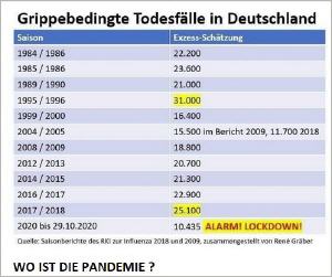 Man macht heute ein Riesentheater um diejenigen, die auf Corona positiv getestet wurden, aber nicht einmal Symptome aufweisen und schickt sie in Quarantäne, weil man behauptet, dass das Covid-Virus so ansteckend sei, dass er von symptomlos Getesteten auf andere Menschen überspringen könnte und weil man die Schwächeren schützen müsse. (Diese bösartigen "Gutmenschen") Warum muß man dann beim Test tief in der Nase des Getesteten herumstochern, wenn er so ansteckend sein soll? Es genügt doch dann, wenn man einfach nur draufspuckt. Klar ist, dass besonders alte Menschen an Covid-19 oder an SARS COV-2 oder an Influenza sterben können. Leider ist das Leben so. Ich bestreite nicht, dass es dieses Virus gibt, aber alte und kranke Menschen sind bedauerlicherweise schon immer auch an Grippe und an Influenza gestorben. 2017/18 war ein schweres Influenza Jahr, aber damals hat man nicht die ganze Wirtschaft heruntergefahren. Grippetote waren früher in den Medien nur eine Randnotiz. Sie müssen nur die Daten von Statista ansehen!