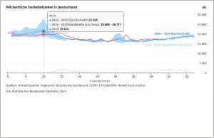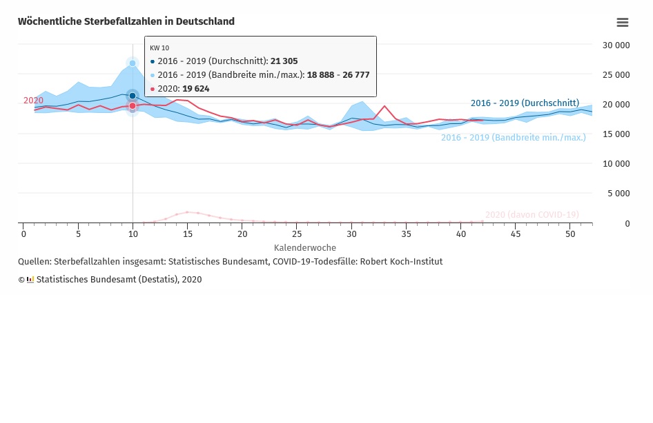 Statistisches Bundesamt Achten Sie auf die KW10 der vergangenenJahre. In rot dargestellt ist Covid 19 im Jahr 2020. Was erkennen Sie? Natülrich wird unsere kongeniale Regierung immer sagen, dass dies nur auf den Lockdown zurückzuführen sei. Eine Win Win Situation für die Regierung: Gehen die Todeszahlen nach oben, dann werden sie sagen, dass die "Coronaleugner" dies verursacht haben durch das Nichteinhalten der Kontaktauflagen und wenn es weniger Tote gibt, dann sagen sie, dass dies auf den Lockdown zurückzuführen sei.