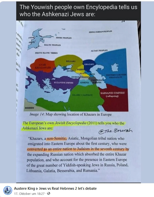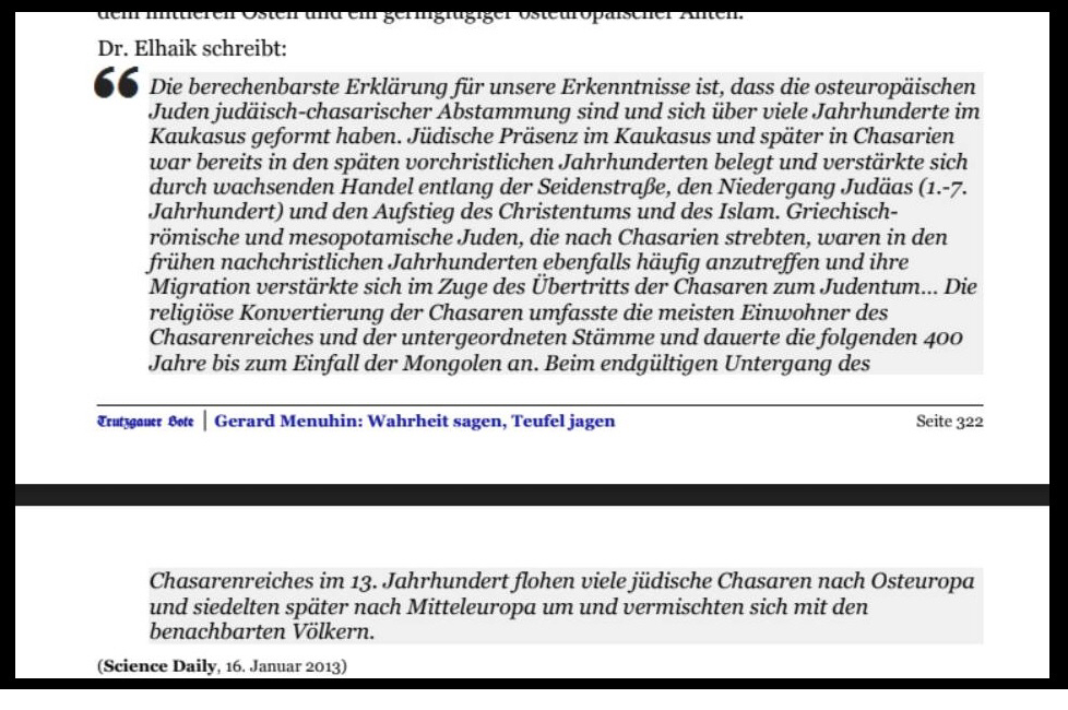 "Obwohl erklärt wird, dass Ashkenazi Juden germanischen/europäischen Ursprung haben und Nachkömmlinge der ursprünglichen biblischen Juden sind, gibt es wenig Beweise für diese Behauptung. Tatsächlich lassen letztlich DNA Analysen den Schluss zu, dass Ashkenazi Juden genetisch von den Khazaren abstammen." https://www.facebook.com/stephan.seit/posts/1162096600482281