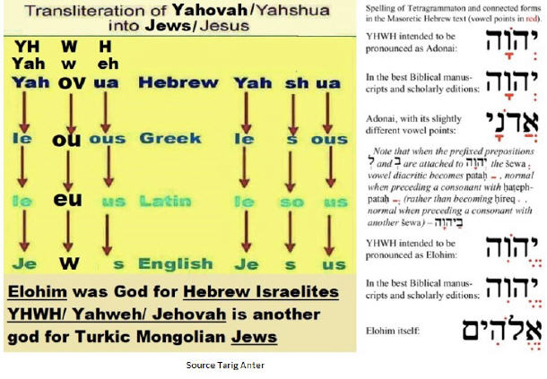 "Der Name JHWH wurde von den Pharisäern und anderen, die den babylonischen Satanismus praktizierten (der Vorläufer des Kabbalismus und des Talmudismus), in den Text des Alten Testaments eingefügt. Für diejenigen, die nicht glauben, dass der Talmud satanisch ist, wird verkündet, dass Christus in der Hölle kocht in Exkrementen und Samen (Gittin, 56b, 57a).