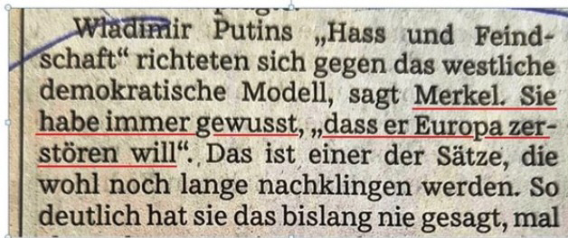 Am 7. Dezember erklärte Merkel gegenüber der Zeit, die Minsker Abkommen seien angenommen worden, um der Ukraine Zeit zu geben und ihr zu helfen, stärker zu werden. Die Ex-Kanzlerin merkte an, dass Putin die Ukraine damals leicht hätte überrennen können."
