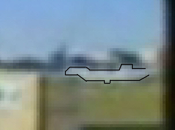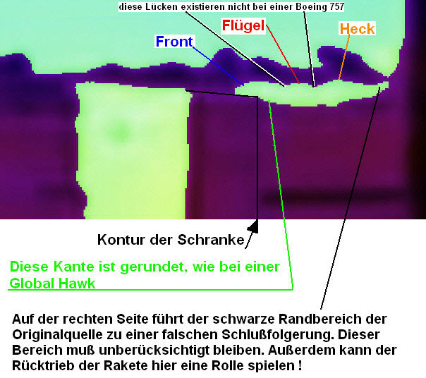 The program Photoimpact is displaing it merciless: Devious nose and hunch. The outcome of this is that it had neither been a Boeing 757 (official version) nor a Boeing 737, but it had been a rocket. Propably it had been a Global Hawk.