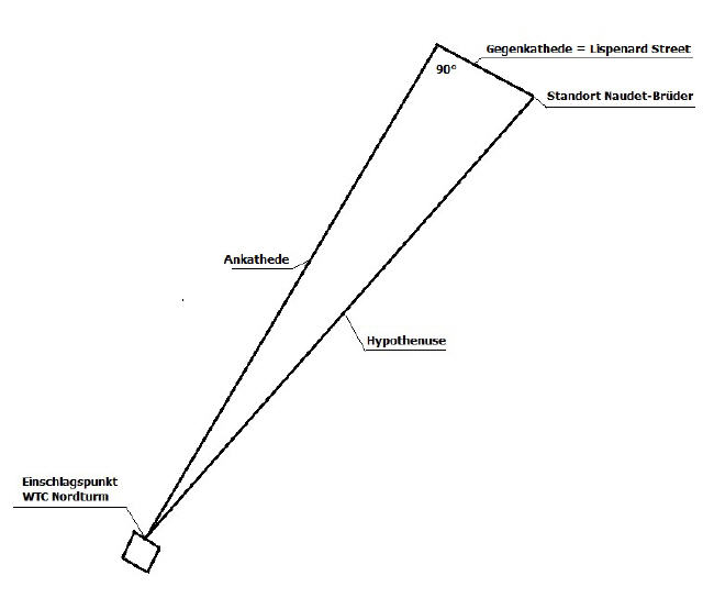 3) Die Nordfassade des WTC ist parallel zur Lispenard Straße, welhalb ich der Einfachheit davon ausgehe, dass das Flugzeug die Lispenard Straße ebenfalls im 90° Winkel schneidet.
