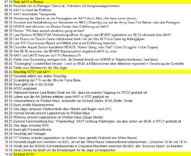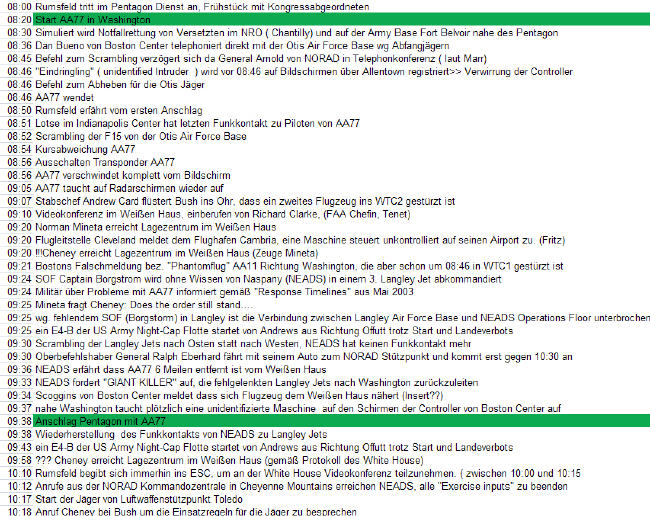 "Während der Zeit, als das Flugzeug auf das Pentagon zuflog, war da ein junger Mann der kam und zu dem Vize-Präsidenten sagte: "Das Flugzeug ist 50 Meilen außerhalb, das Flugzeug ist 30 Meilen außerhalb" und als er dann sagte, dass das Flugzeug noch 10 Meilen außerhalb war, sagte der junge Mann zum Vizepräsidenten "Steht die Order noch?" Und der Vizepräsident drehte sich um, drehte seinen Nacken und sagte: "Natürlich steht die Order noch! Haben Sie irgendetwas gegensätzliches gehört. Aber zu dieser Zeit wußte ich nicht was das bedeutete".