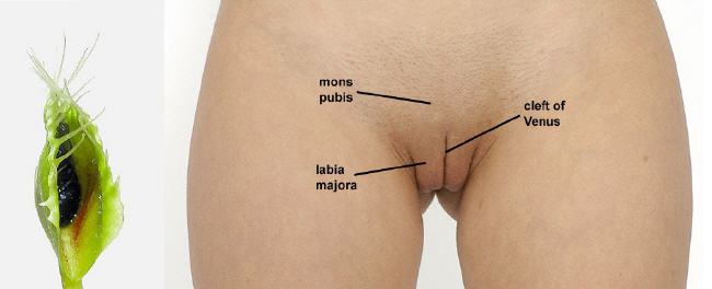 Zur Erklärung: Auf der linken Seite sehen Sie definitionsgemäß nach Wikipedia eine Klappfalle der Venusfliegenfalle mit Beute. Auf der rechten Seite sehen Sie ( ohne Beute) einen rasierten "Venushügel, lateinisch als "mons pubis" oder auch als "mons verenis" bezeichnet. Ich persönlich würde das rechte Bild bevorzugen, auch wenn mir unrasiert, wie im Bild links abgebildet, doch lieber wäre. ( Ein Zeichen meiner Naturverbundenheit. Man darf einfach in die Natur nicht eingreifen und schon gar nicht mit irgendwelchen scharfen Klingen ! Bevor ich allerdings mit meinen typisch männlichen Phantasien gentechnisch eingreife, fahre ich besser im Text fort ! )